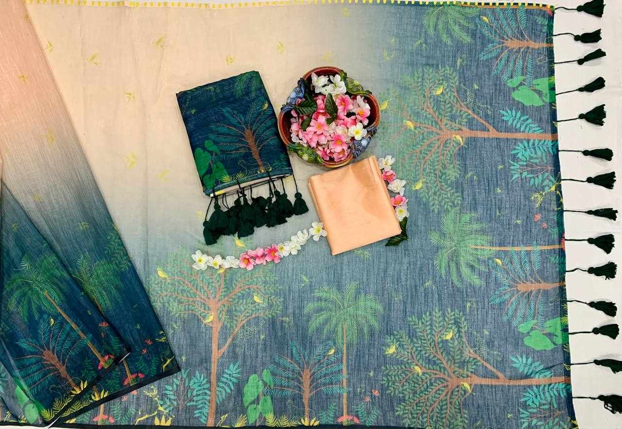 Saree Fabric: Soft Linen Cotton with beautiful digital print and elegant handmade cotton tassels